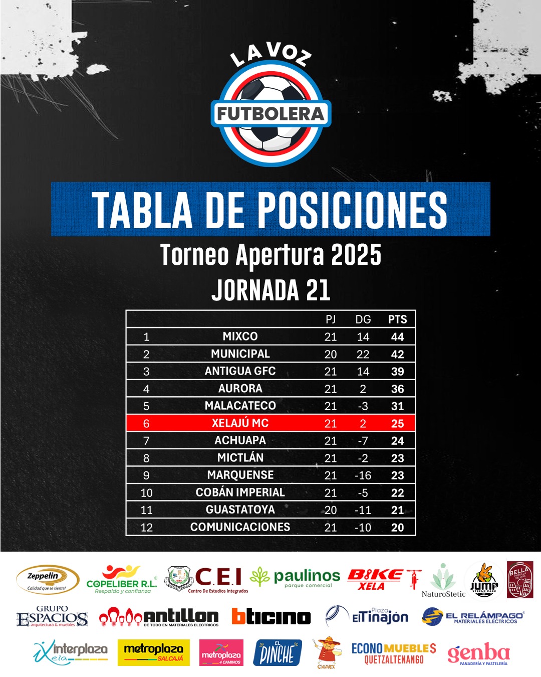 Xelajú MC continúa aferrado a la pelea por un lugar protagónico en la temporada 2025-2026 de la Liga Nacional. Tras 21 jornadas del Apertura 2025, el cuadro quetzalteco se mantiene en la mitad inferior de la tabla acumulada con 25 puntos y una diferencia de +2, una cifra que lo posiciona en terreno competitivo tanto para asegurar la permanencia en el actual torneo.