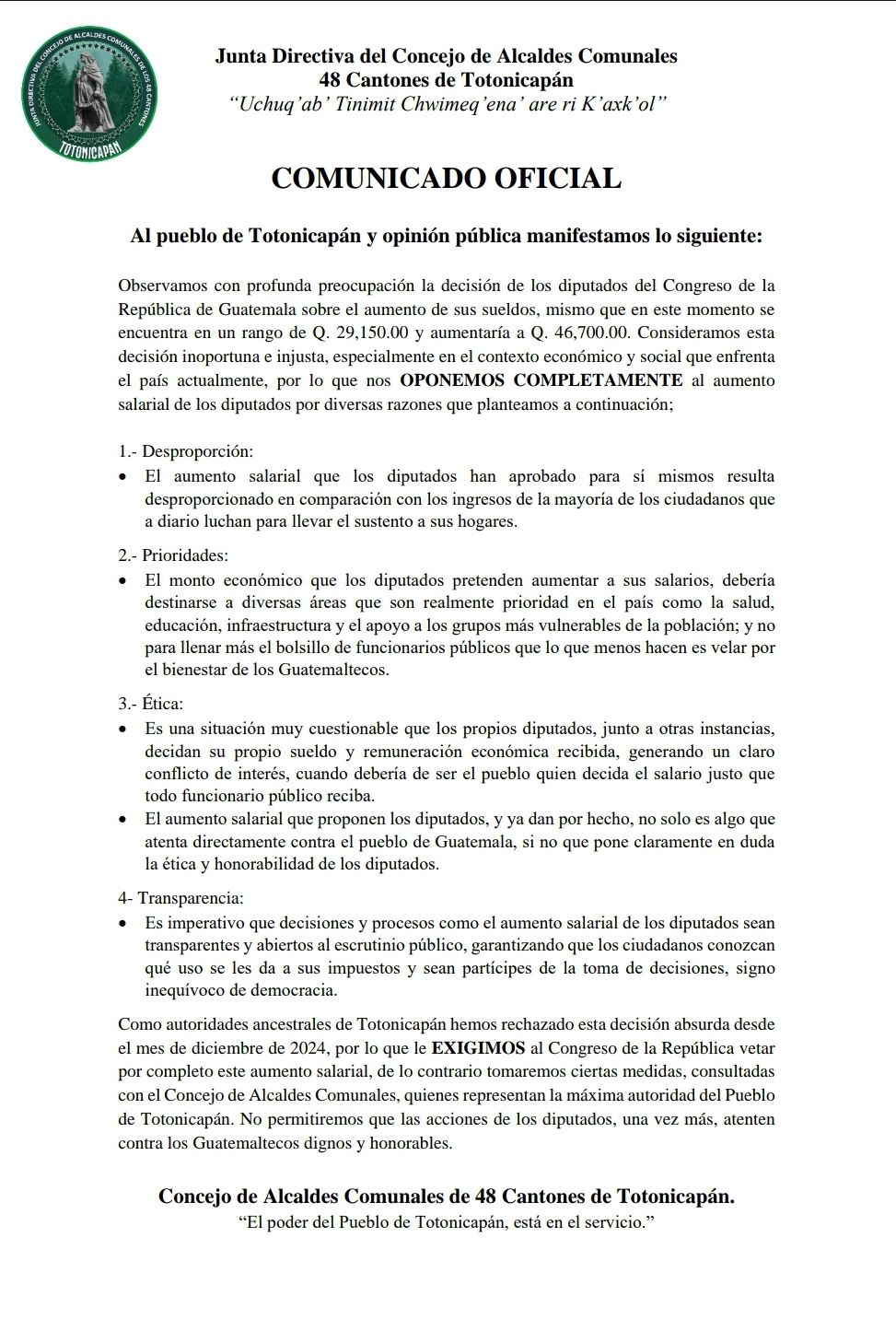 Los representantes indígenas recalcaron que un incremento del 60 por ciento en los salarios de los diputados contrasta con la situación del resto de la población, donde los aumentos salariales rara vez superan el 5 por ciento.