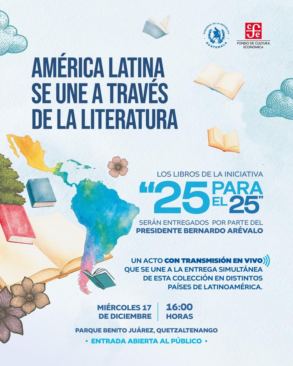 En un evento que busca celebrar la unión de América Latina a través de la literatura, el presidente de la República, Bernardo Arévalo, junto con la Ministra de Cultura y Deportes, Liwy Grazioso, entregarán la colección “25 para el 25” en el Parque Benito Juárez de Xela este miércoles 17 de diciembre.