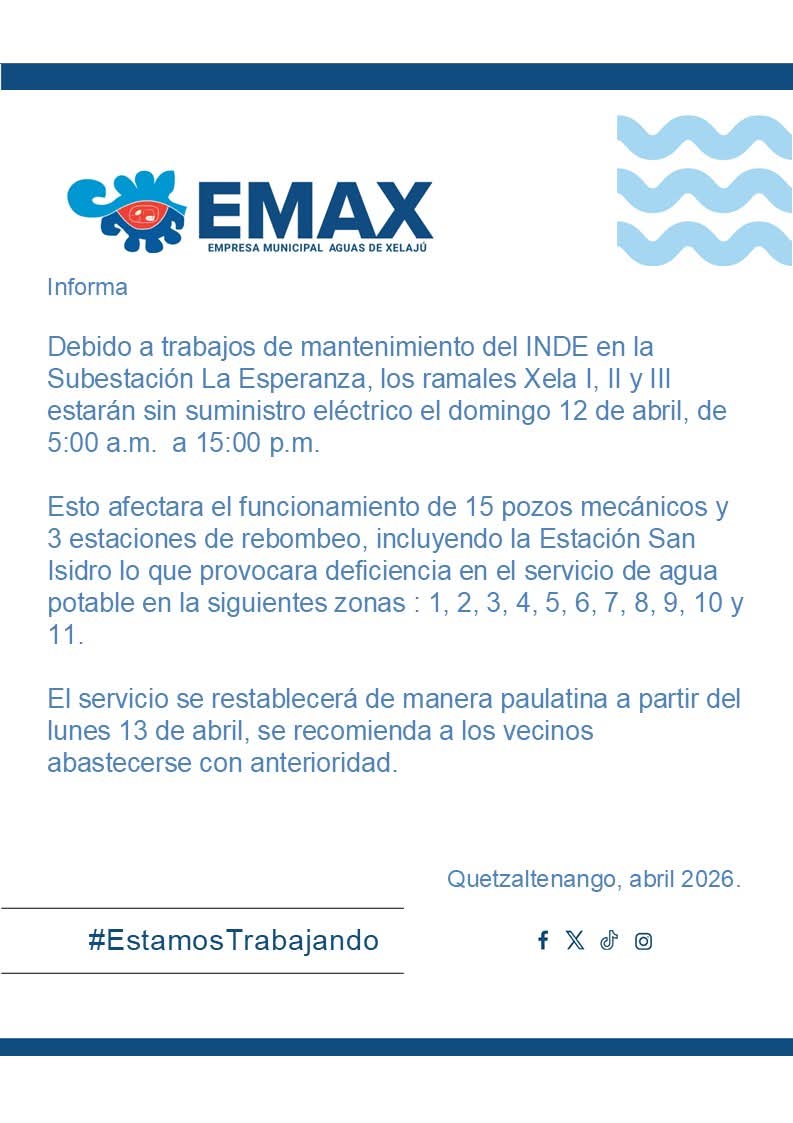 La Empresa Municipal Aguas de Xelajú (EMAX) informa sobre deficiencias en el servicio de agua potable para este domingo 12 de abril, como consecuencia directa de los trabajos de mantenimiento eléctrico programados en la subestación La Esperanza. Según detalló la entidad, la suspensión del suministro eléctrico que, afectará los ramales Xela I, II y III entre las 05:00 y 15:00 horas, impactará el funcionamiento de al menos 15 pozos mecánicos y tres estaciones de rebombeo, incluyendo la Estación San Isidro. Esta situación eliminará la capacidad de distribución de agua en gran parte del municipio. Las zonas más afectadas serán las comprendidas entre la 1 y la 11 de Quetzaltenango, donde los usuarios podrían experimentar ausencia total del servicio durante el día. Las autoridades explicaron que el sistema de agua depende en gran medida de la energía eléctrica para operar los equipos de extracción y distribución, por lo que cualquier interrupción incide directamente en el abastecimiento. EMAX indicó que el servicio comenzará a restablecerse de forma gradual a partir del lunes 13 de abril, una vez se normalice el suministro eléctrico en las áreas afectadas. Ante esta situación, la institución recomendó a la población almacenar agua con anticipación y hacer un uso responsable del recurso durante el período de afectación. Estas acciones buscan mitigar el impacto en los hogares mientras se desarrollan los trabajos de mantenimiento programados.