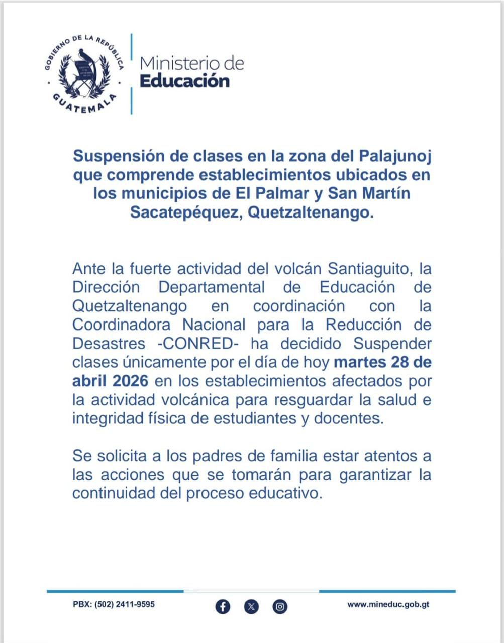 Ante el incremento en la actividad del volcán Volcán Santiaguito, autoridades educativas suspendieron clases este martes 28 de abril de 2026 en establecimientos ubicados en la zona que comprende centros educativos de los municipios de El Palmar y San Martín Sacatepéquez.