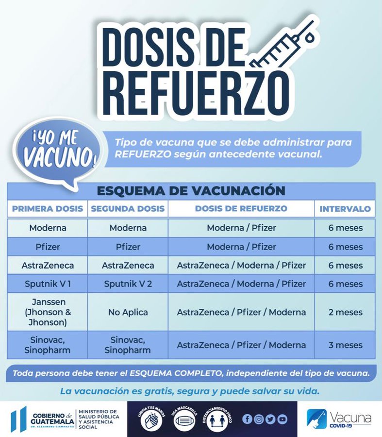 El gobierno de Guatemala inició con la inmunización con refuerzo a toda la población en diciembre de 2021; hasta el momento, el requisito es que ya hayan pasado seis meses desde la aplicación de la segunda dosis, sin embargo Salud declaro que ya está analizando reducir el tiempo.