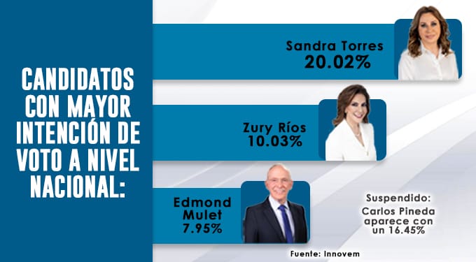 Dicho lo anterior, estos son los resultados de la intención de voto a nivel nacional: Sandra Torres, de la Unidad Nacional de la Esperanza, Une, sale con 20.02%; Carlos Pineda, de Prosperidad Ciudadana, con un 16.45%; Zury Ríos, de Valor-Unionista, con un 10.03%; Edmond Mulet, de Cabal, con 7.95%; y Manuel Conde, de Vamos, con un 2.90%. Los demás candidatos están por debajo de 2% cada uno.