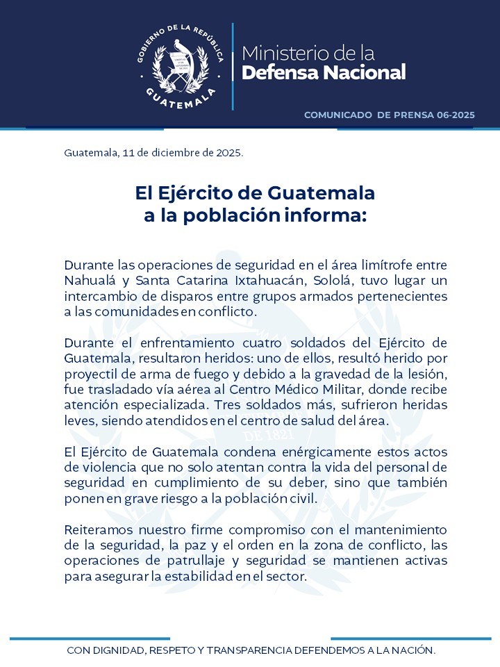 El Ministerio de la Defensa Nacional informa, mediante el Comunicado de Prensa 06-2025, que durante operaciones de seguridad realizadas en el área limítrofe entre Nahualá y Santa Catarina Ixtahuacán, Sololá, se registró un intercambio de disparos entre grupos armados pertenecientes a comunidades en conflicto.
