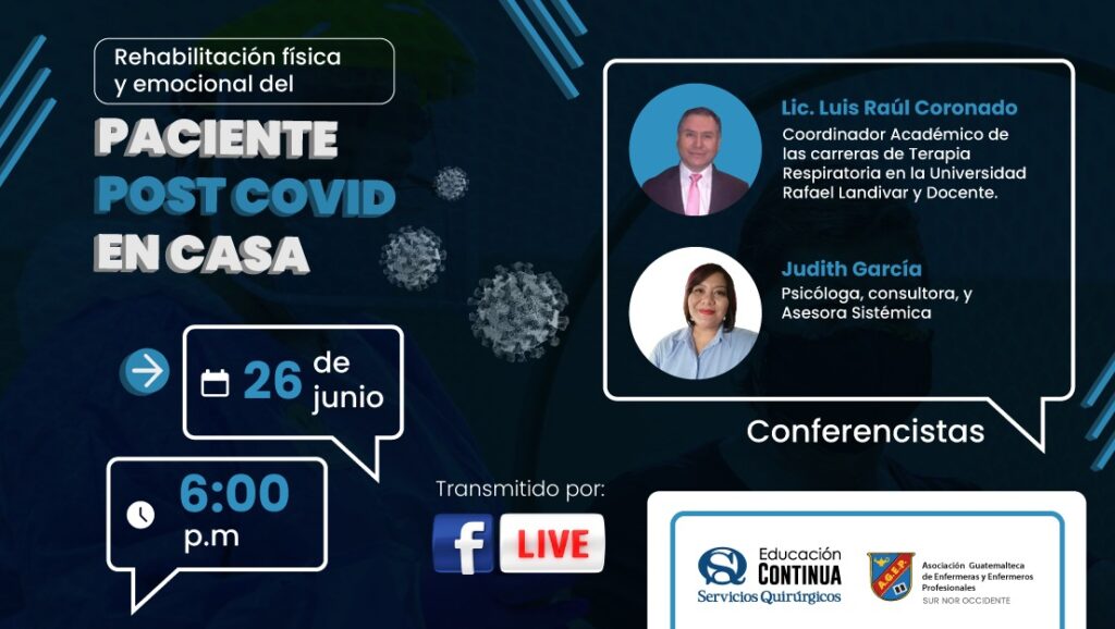 Los conferencistas son Luis Raúl Coronado, quien es coordinador Académico de la carrera de Terapia Respiratoria de la universidad Rafael Landivar y docente y Judith García, quien es psicóloga, consultora y asesora sistématica.
