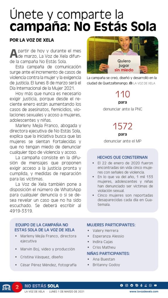 Este 1 de marzo del 2021 inicia la campaña No Estas Sola, del diario digital La Voz de Xela.