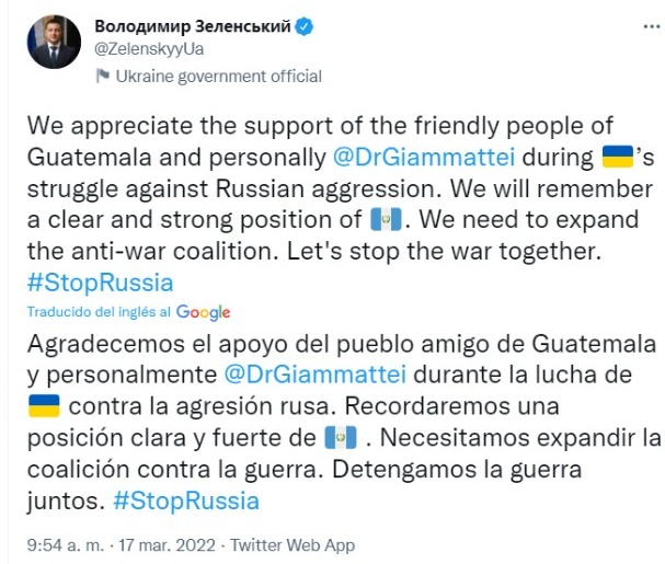 El tuit de Zelenski continua y finaliza así: "Recordaremos una posición clara y fuerte de Guatemala. Necesitamos expandir la coalición contra la guerra. Detengamos la guerra juntos".