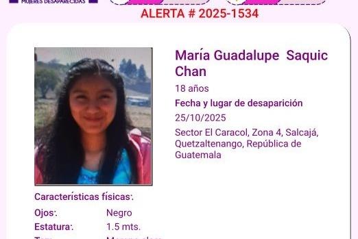 María Guadalupe Saquic Chan, de 18 años, desapareció el reciente 25 de octubre de 2025 en el sector El Caracol, zona 4, Salcajá, Quetzaltenango.