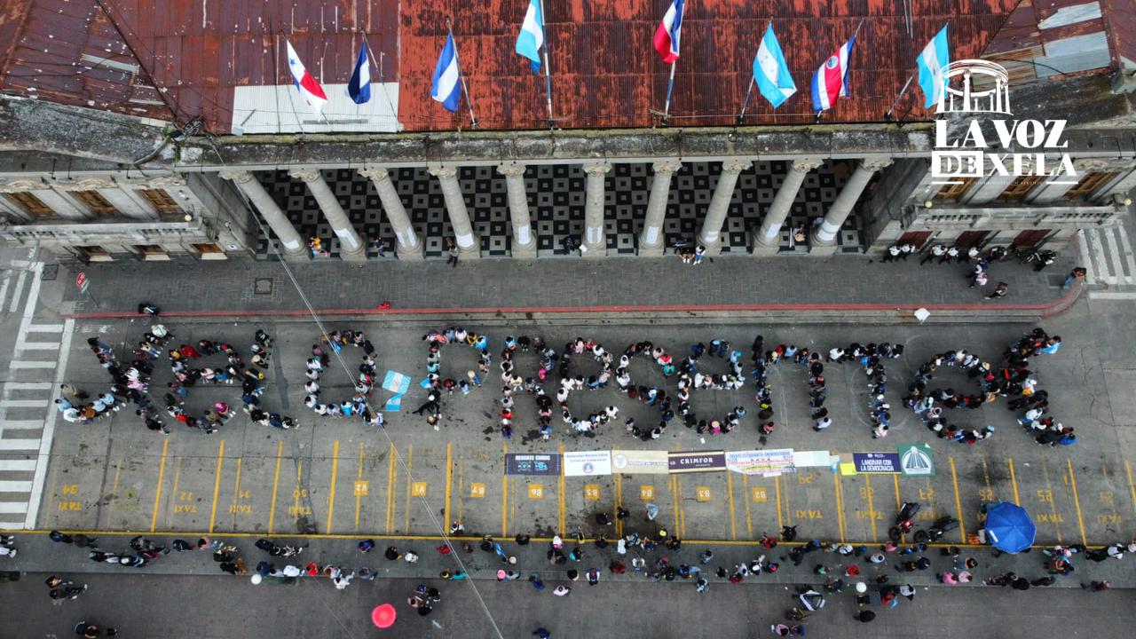 Primero trazaron las letras con yeso y luego los ciudadanos sedientos de libertad y respeto a la democracia se ordenaron para formar la frase poderosa e histórica: XELA PRESENTE.